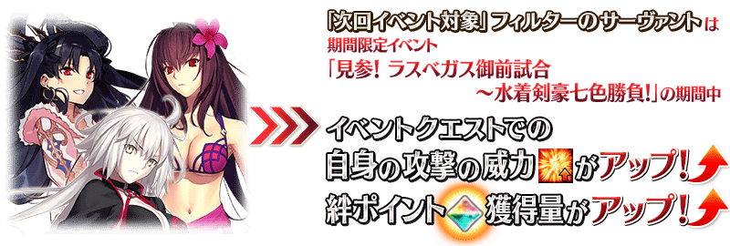 本イベントの期間中、下表のサーヴァントはイベントクエストにおいて「自身の攻撃の威力がアップ」と「絆ポイント獲得量がアップ」のボーナスが得られます!