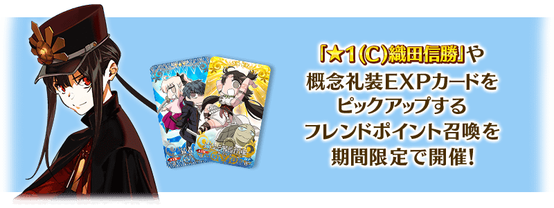 本フレンドポイント召喚からは、通常のフレンドポイント召喚から排出されるものに加え、「★1(C)織田信勝」のほか、概念礼装を大幅に強化できるEXPカード「★4(SR)ようこそ邪馬台国!」「★3(R)猛者と無敵」が排出されるようになります。