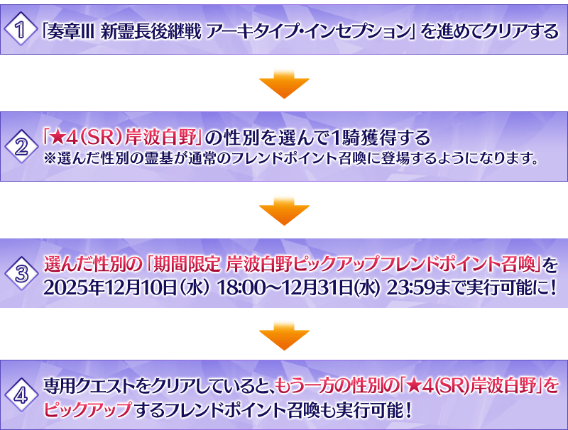 ※「奏章Ⅲ 新霊長後継戦 アーキタイプ・インセプション」のクリア時に獲得した性別の召喚が実行可能です。男女両方の「★4(SR)岸波白野」が通常のフレンドポイント召喚の排出対象になっている場合は両方の召喚を実行できます。