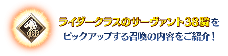 ※★4(SR)以上確定にはサーヴァントと概念礼装が含まれます。 ※ライダークラス以外のサーヴァントも排出されますのでご注意ください。 ※2019年1月1日(火) 0:00以降に新たに配信されるメインストーリー、期間限定イベント、一部クエスト、キャンペーンおよび召喚では、真名隠し対象サーヴァントの真名が表示されます。