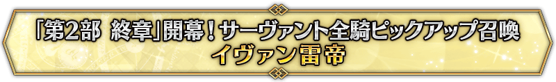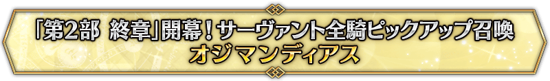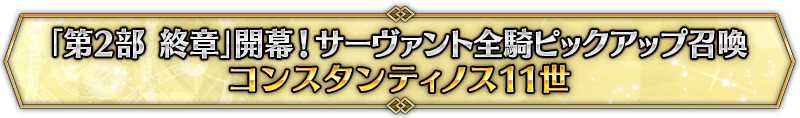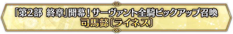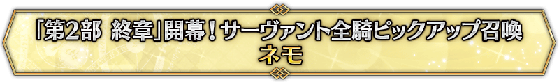 なお、本召喚は『「第2部 終章」開幕! サーヴァント全騎ピックアップ召喚』ピックアップスケジュールに記載された日程で召喚内容が切り替わりますが、開催期間内において複数回おこなわれる同名ピックアップ召喚は召喚回数がリセットされずに引き継がれます。