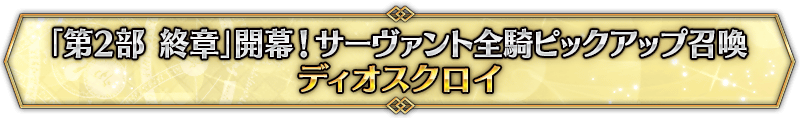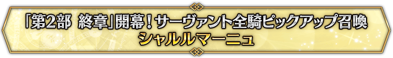 なお、本召喚は『「第2部 終章」開幕! サーヴァント全騎ピックアップ召喚』ピックアップスケジュールに記載された日程で召喚内容が切り替わりますが、開催期間内において複数回おこなわれる同名ピックアップ召喚は召喚回数がリセットされずに引き継がれます。