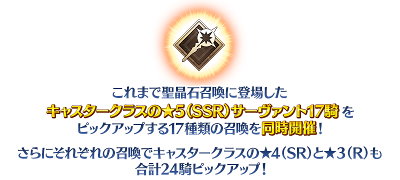 2025年12月3日(水)に予定している「冠位戴冠戦:Caster」の開幕に先駆けて、これまで聖晶石召喚に登場した期間限定サーヴァントを含むキャスタークラス41騎をピックアップする17種類の召喚を同時開催いたします!