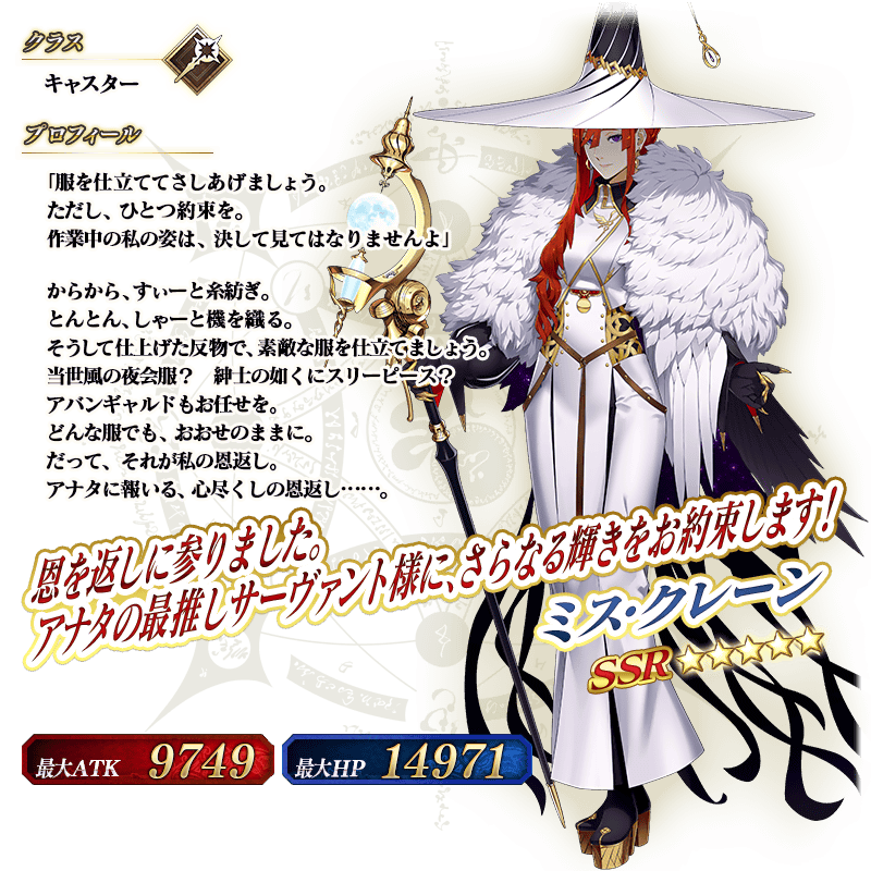 ※上記の「★5(SSR)ミス・クレーン」のイラストは霊基再臨第2段階のものです。