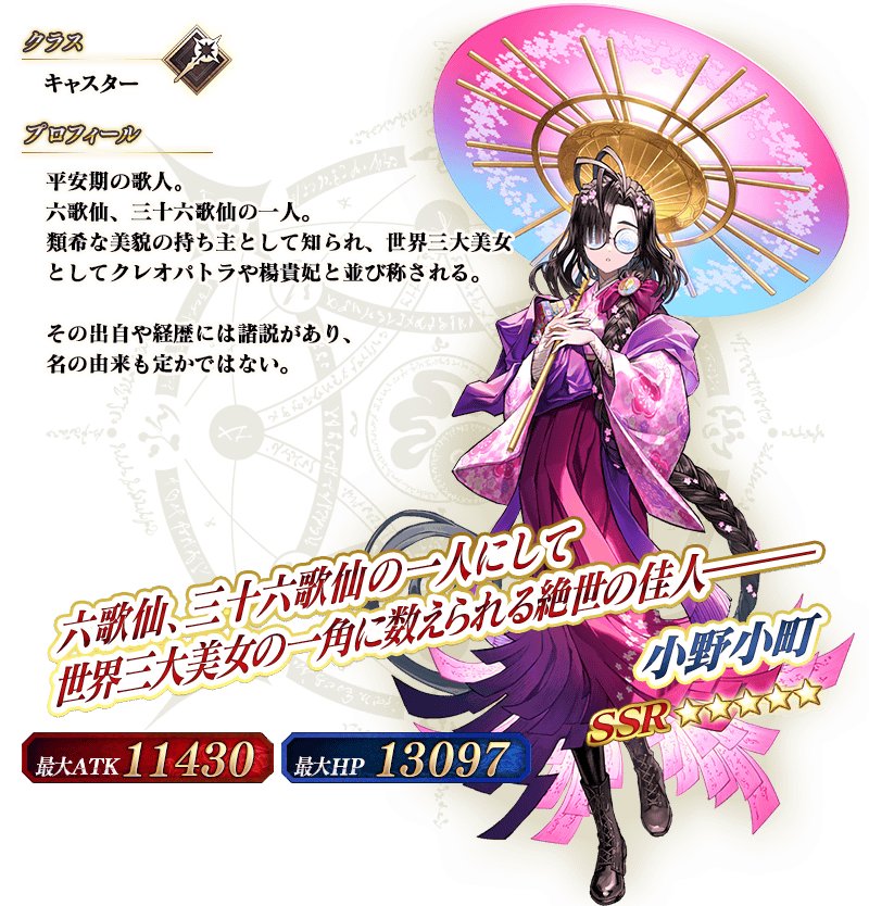 ※「★5(SSR)小野小町」は、霊基再臨してもセイントグラフおよびバトルキャラなどが封印されており第2段階までしか変化しません。