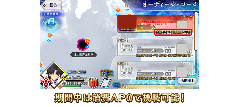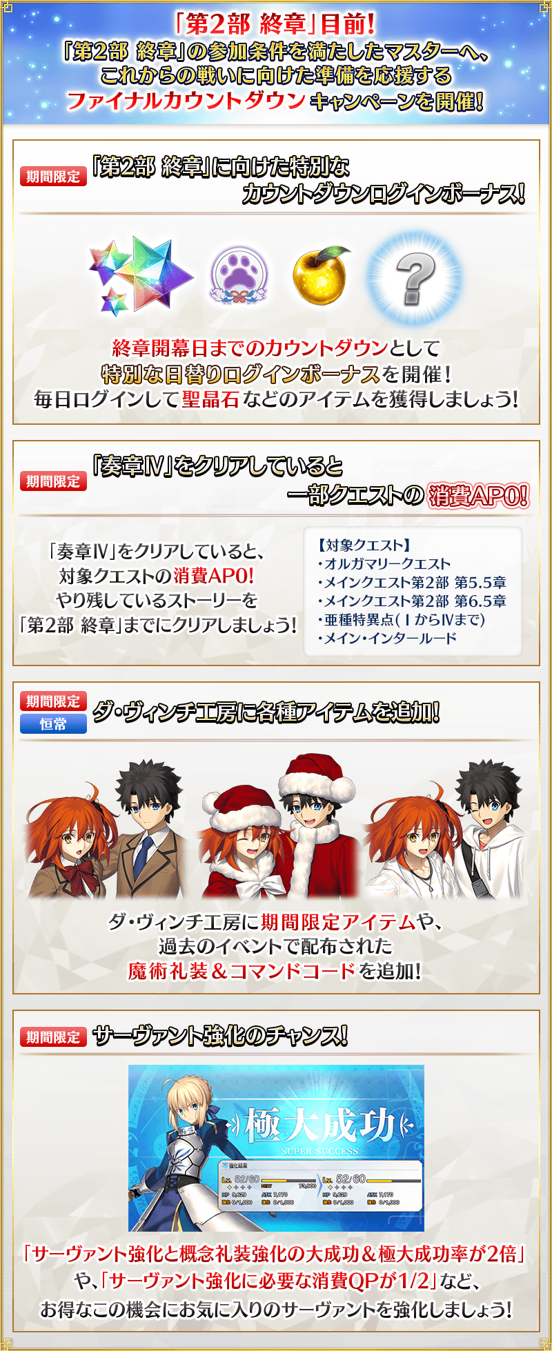 「奏章Ⅳ 人類裁決法廷 トリニティ・メタトロニオス」をクリアしていると、下記の期間中、メインクエスト第2部 第5.5章、第2部 第6.5章、亜種特異点(ⅠからⅣまで)、メイン・インタールードのメインクエストの消費APが0になります!