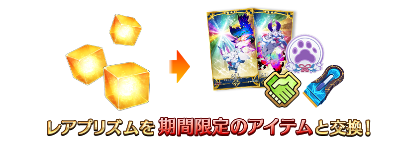 ※「レアプリズムを交換」に追加されるイベント限定魔術礼装は恒常となり、交換期限はありません。 ※すでに交換対象の魔術礼装を取得されている方については、交換することができません。 ※すでに「レアプリズムを交換」で交換していた場合は、無料化条件を満たした時点で「交換に使用した同数のレアプリズム」がプレゼントボックスに返還されます。
