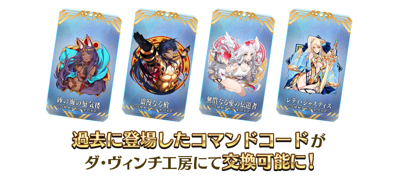 ダ・ヴィンチ工房の「レアプリズムを交換」に、過去の期間限定イベントで登場した★5(SSR)コマンドコード4種を恒常的に追加いたします!