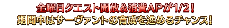 期間限定で、カルデアゲート内に曜日ごとに出現するすべての曜日クエストの消費APが1/2となります!(バトルにおいて撤退した場合でも、同様の消費量になります)