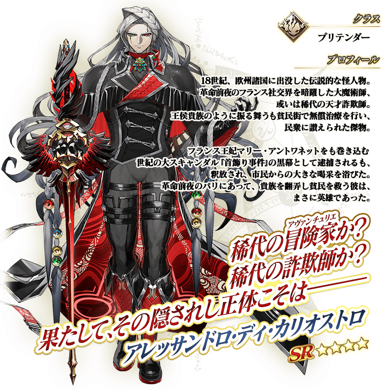 ※上記の「★4(SR)アレッサンドロ・ディ・カリオストロ」のセイントグラフとイラストは霊基再臨第2段階のものです。