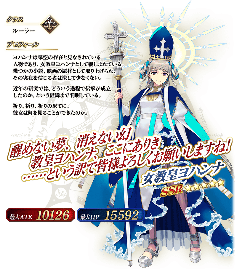 ※上記の「★5(SSR)ジャンヌ・ダルク(ルーラー)」のイラストは霊基再臨第2段階のものです。