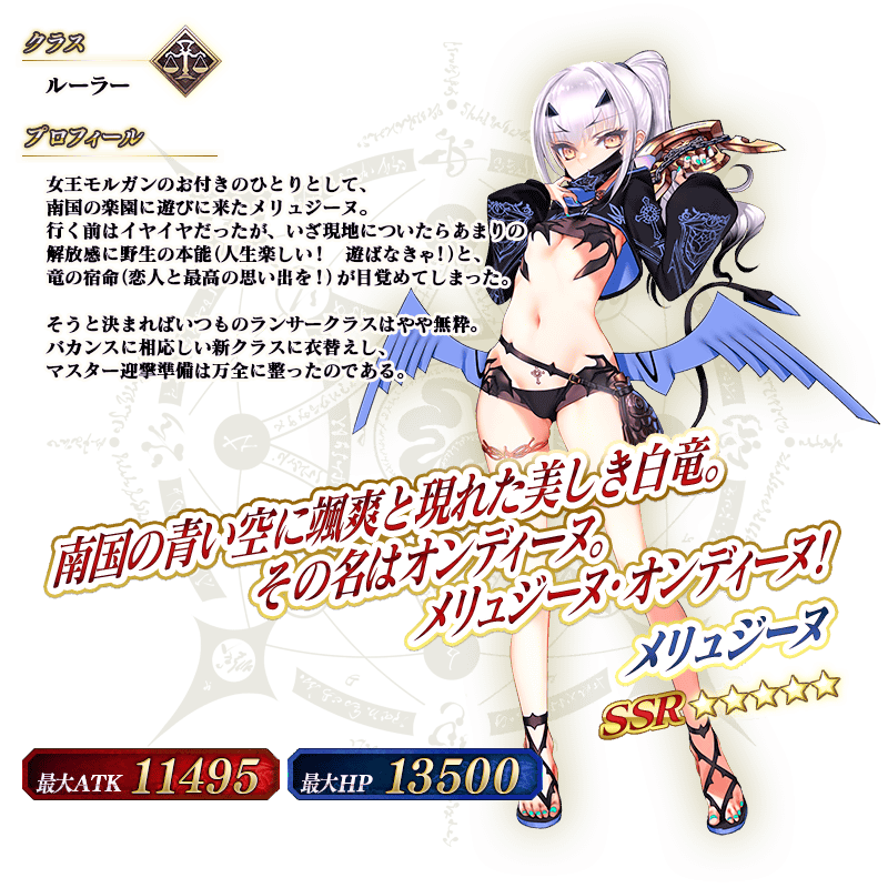 ※「謎のアルターエゴ・Λ」はサーヴァント名となり、クラスはランサーとなりますのでご注意ください。 ※「★5(SSR)メリュジーヌ(ランサー)(妖精騎士ランスロット)」は、「★5(SSR)妖精騎士ランスロット」を霊基再臨第2段階にすることで名称が「★5(SSR)メリュジーヌ」に変化します。 ※「★5(SSR)メリュジーヌ(ランサー)(妖精騎士ランスロット)」の霊基再臨第3段階は、「Lostbelt No.6 妖精円卓領域 アヴァロン・ル・フェ 星の生まれる刻」のネタバレを含みます。あらかじめご了承ください。