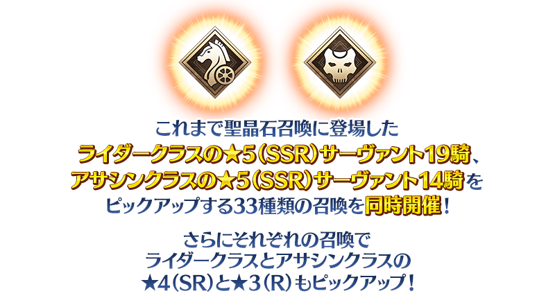 期間限定『「冠位戴冠戦:Rider」&「冠位戴冠戦:Assassin」ストーム・ポッド消費0!キャンペーン』にあわせて、これまで聖晶石召喚に登場した期間限定サーヴァントを含むライダークラス38騎、アサシンクラス33騎をピックアップする33種類の召喚を同時開催いたします!