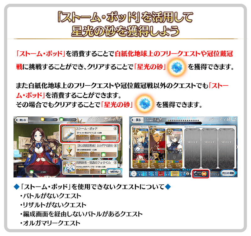 ※「ストーム・ポッド」は所持上限(9個)を超えての獲得および交換はできません。 ※各ミッション報酬で入手できる「星光の砂」や、これまでに「ストーム・ポッド」を消費して「星光の砂」を十分に獲得していた方は、ダ・ヴィンチ工房への追加分を使用せずにクラススコアのサインをすべて解放できます。