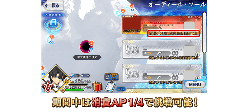 ※バトルにおいて撤退した場合でも、同様の消費量になります。 ※「霊基解放クエスト」は消費AP1/4の対象外となります。