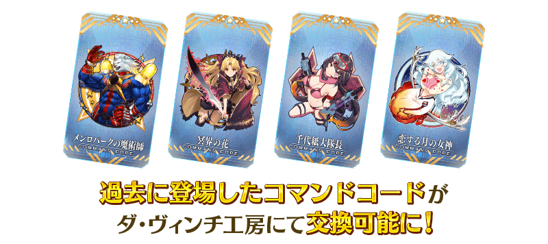 ダ・ヴィンチ工房の「レアプリズムを交換」に、過去の期間限定イベントで登場した★5(SSR)コマンドコード4種を恒常的に追加いたします!