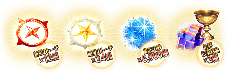 すべてのミッションをクリアすることで合計で聖杯2個、伝承結晶2個、新星のトーチ12個、明星のトーチ24個、星光の砂6,900個を獲得できます!