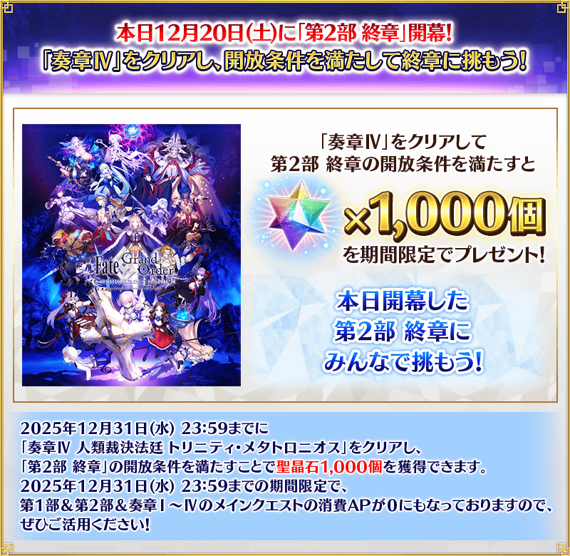 限定 「第2部 終章」開放条件「奏章Ⅳ」クリアで聖晶石1,000個プレゼントの期間を延長!