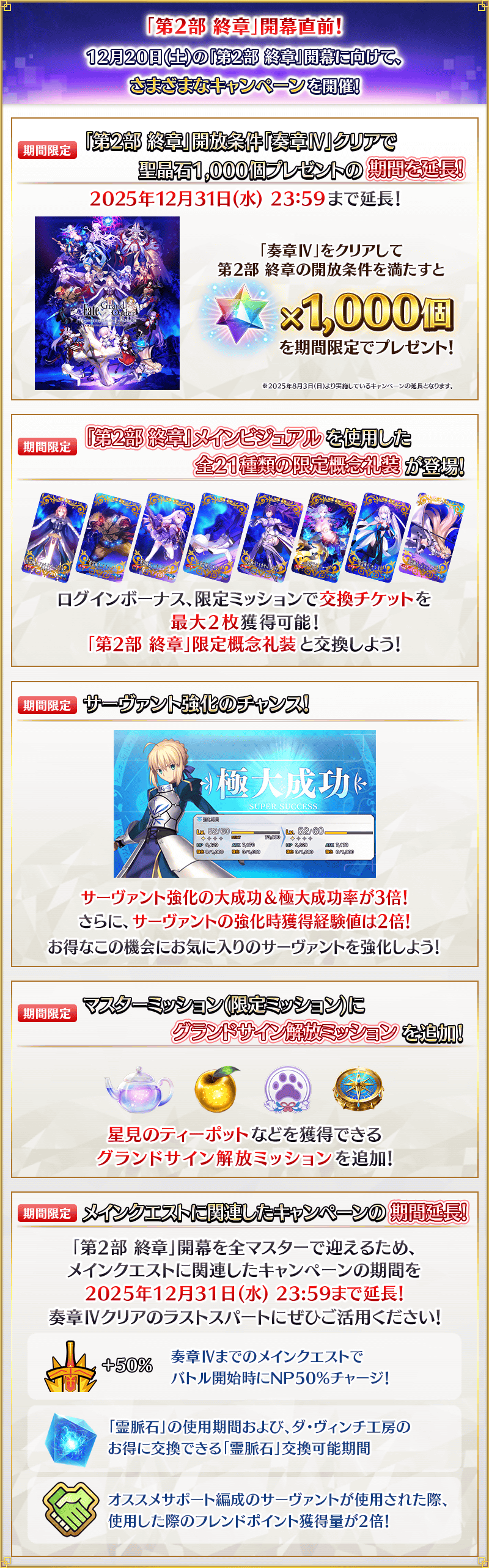 【12月20日(土) 18:00更新】 【期間限定】「第2部 終章」開放条件「奏章Ⅳ」クリアで聖晶石1,000個プレゼントの期間を延長! 【期間限定】「第2部 終章」限定概念礼装を新規追加!「英霊極点交換チケット」と交換で、期間限定概念礼装を2枚入手可能に! 【期間限定】サーヴァントの強化大成功&極大成功率が3倍!さらに、サーヴァントの強化獲得経験値2倍! 【期間限定】マスターミッション(限定ミッション)にグランドサイン解放ミッションを追加! 【期間限定】期間延長!「第2部 終章」開幕までの特別企画!奏章Ⅳまでのメインクエストでバトル開始時にNP50%チャージ! 【期間限定】コンティニューアイテム「霊脈石」の使用期間および、ダ・ヴィンチ工房のお得に交換できる「霊脈石」交換可能期間を延長! 【期間限定】期間延長!オススメサポート編成のサーヴァントが使用された際、使用した際のフレンドポイント獲得量が2倍! 【恒常】マテリアル(ギャラリー)に過去のイベントクエストを追加!