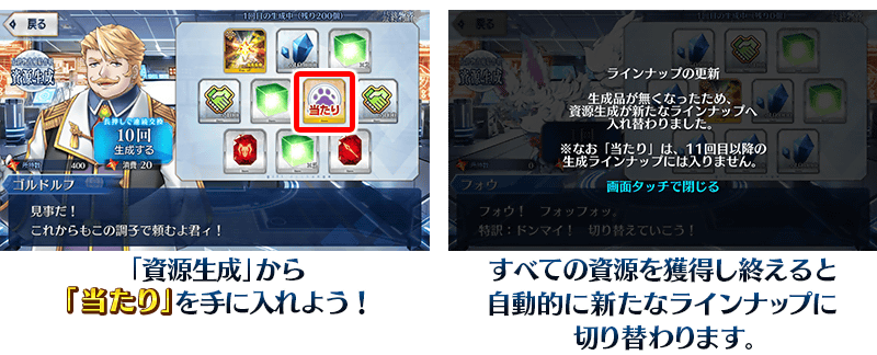 「当たり」を獲得し、「資源生成を更新」をタッチすると、次のラインナップに切り替わります。
