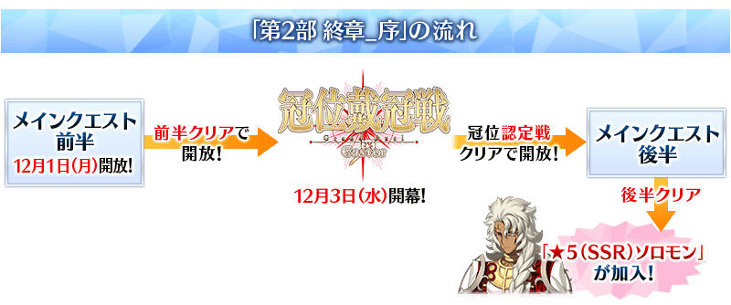 2025年12月3日(水)開幕の「冠位戴冠戦:Caster」の冠位認定戦をクリアすると開放される「第2部 終章_序」後半をクリアすることで、「★5(SSR)ソロモン」が加入します!