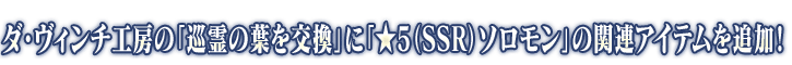 ダ・ヴィンチ工房の「巡霊の葉を交換」にて、「★5(SSR)ソロモン」のサーヴァントコインおよび宝具強化専用霊基が恒常的に追加されました。