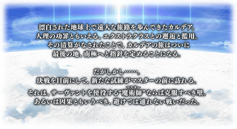 ※本サーヴァントは、霊基再臨によるバトルキャラの見た目の変化はありません。 ※本サーヴァントは「特別再臨(サーヴァント進化)」の対象外となりますのでご注意ください。 ※本サーヴァントは、バレンタインイベントの概念礼装(チョコレート・お返し)の受け渡しイベントはございません。 ※本サーヴァントは、「第2部 終章_序」をクリアしていない状態でも「第2部 終章」のストーリーを進めることで加入します。