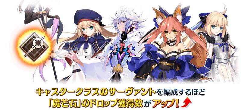 対象クエストで獲得できる「魔芒石」のドロップ獲得数は、パーティに編成したキャスタークラスのサーヴァント1騎ごとに1個増加します。