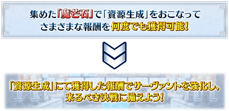 また、「冠位戴冠戦:Caster」と同時に始まる「最終物資補給作戦」にて「資源生成」をおこなうために必要な「魔芒石」を冠位研鑽戦の戦利品として獲得できます。