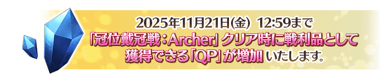| 【冠位戴冠戦開幕記念】 11/20(木)0:00~11/21(金)12:59にいずれかの『冠位戴冠戦:Archer』のクエストを2回クリアせよ |