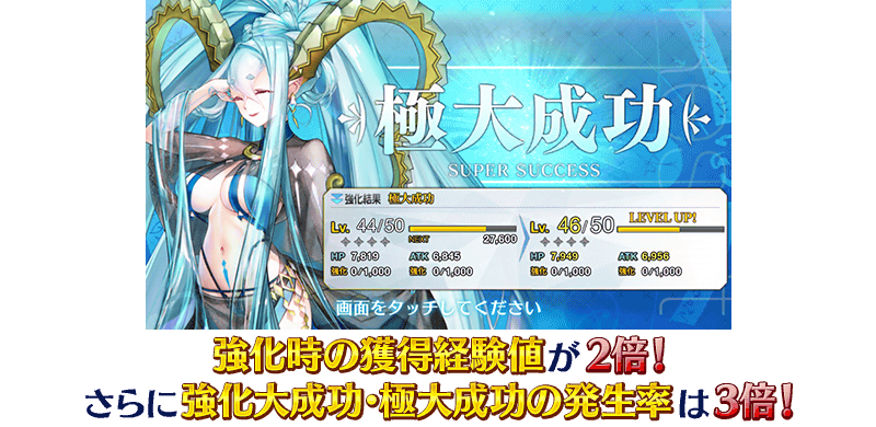 さらに、大成功(経験値2倍ボーナス)・極大成功(経験値3倍ボーナス)の発生率は3倍になります!