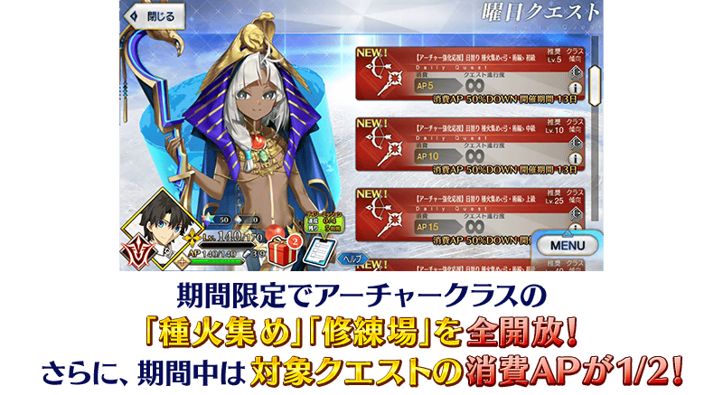 また、期間中、対象の「種火集め」「修練場」の消費APが1/2になります!