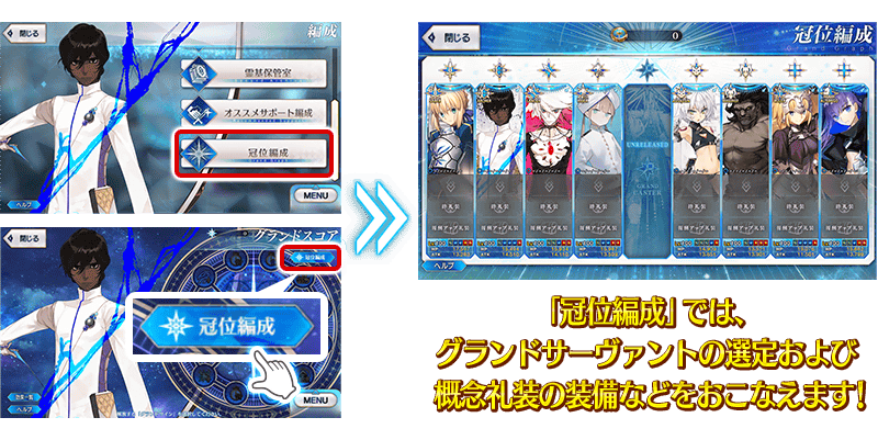 ※クエスト挑戦時のグランドサーヴァント編成枠にて、装備する礼装を変更することも可能です。変更をおこなった際は、「冠位編成」にも変更後の概念礼装の設定が反映されます。 ※「冠位戴冠戦」のクエスト選択場面からも「冠位編成」に移動できます。