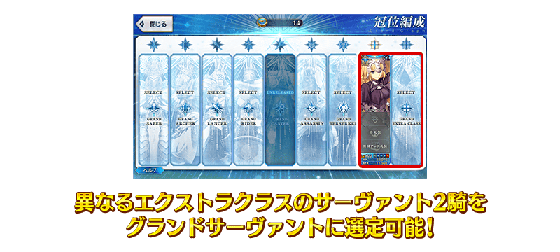 エクストラクラスのサーヴァントは、エクストラⅠ(ルーラー、アヴェンジャー、ムーンキャンサー、シールダー)もしくはエクストラⅡ(アルターエゴ、フォーリナー、プリテンダー、ビースト)から2騎をグランドサーヴァントとして選定し、冠位を戴冠させることができます。