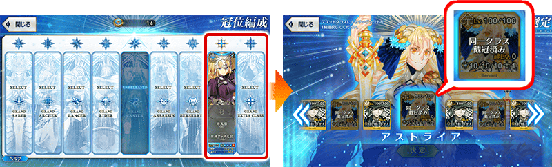 ※同一グループのサーヴァント2騎をグランドサーヴァントに選定することは可能ですが、「冠位研鑽戦」および「冠位認定戦」における『グランドサーヴァントのみを編成できる枠』に編成できるのは1騎のみとなります。