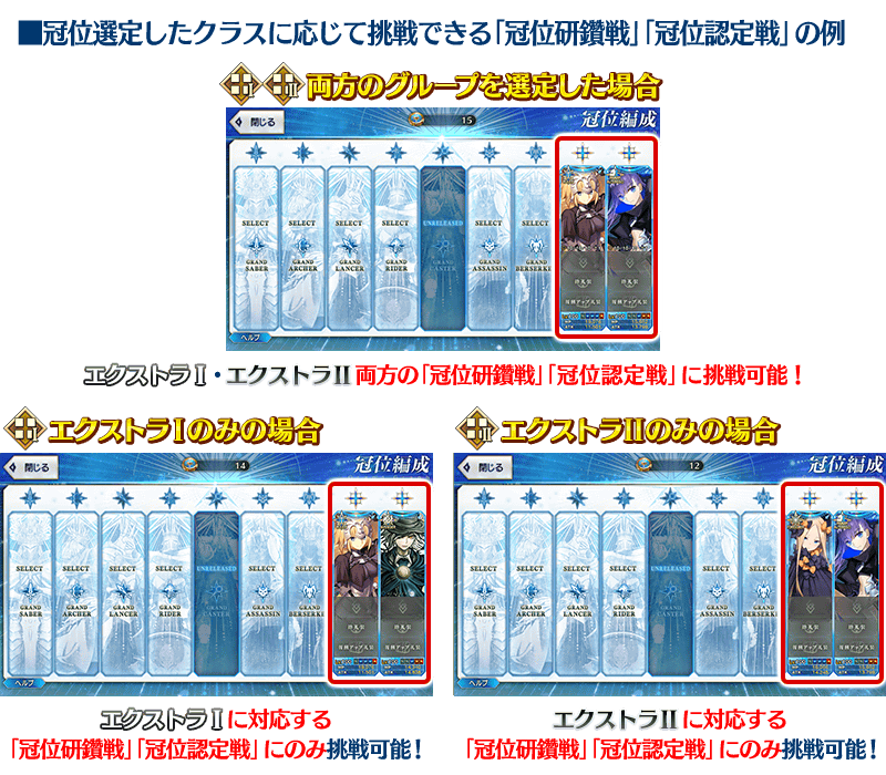 『冠位戴冠戦:Extra』の「冠位研鑽戦」「冠位認定戦」は、エクストラⅠとエクストラⅡに分かれており、それぞれ対応したグループのクラスのサーヴァントのみ挑戦することができます。