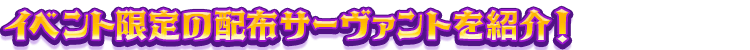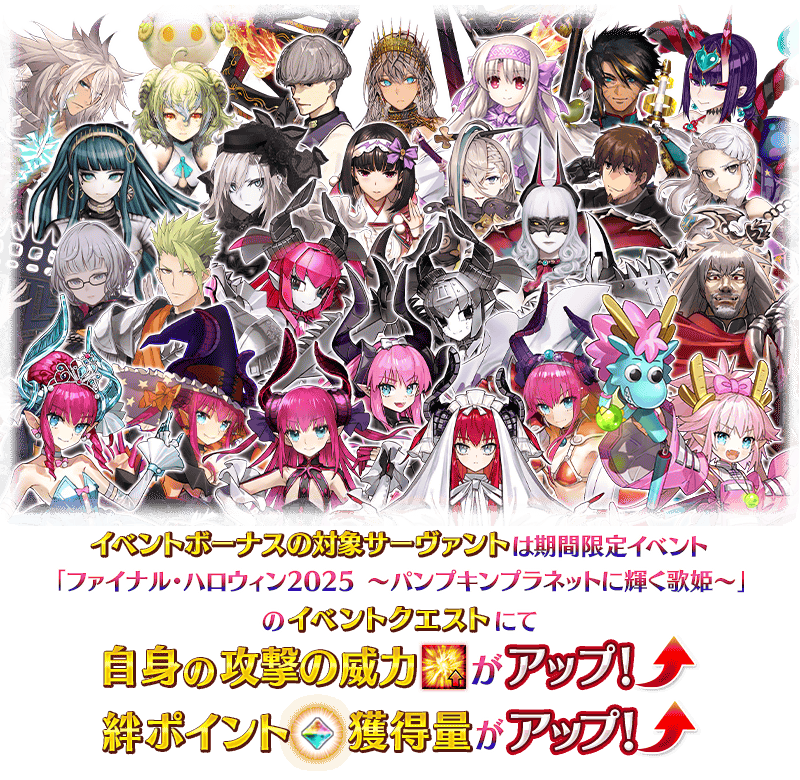 ※対象のサーヴァントとなっていても、本イベントのメインシナリオに登場しない場合があります。 ※10月17日(金) 18:00より、サーヴァント選択画面やサーヴァント強化画面などに、イベントボーナスフィルターが追加されております。イベントで活躍するサーヴァントのみを表示する便利な機能となりますので、こちらもあわせてご活用ください。
