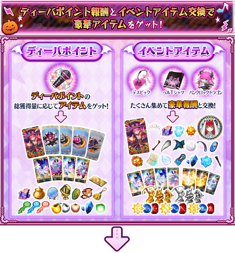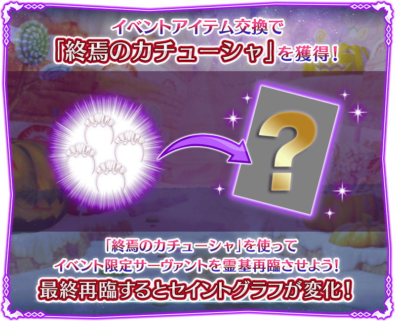 ※「★4(SR)終わりのエリザベート」の霊基再臨素材「終焉のカチューシャ」とサーヴァントコインは、メインクエスト第十節をクリアして「★4(SR)終わりのエリザベート」を加入させることで交換可能となります。 ※伝承結晶、英霊結晶・流星のフォウくんALL★4(HP)、英霊結晶・日輪のフォウくんALL★4(ATK)については、後日開放される本イベントのメインクエストを第十節までクリアすることで交換可能になります。 ※イベントアイテム交換期間終了後「パンクロックドラゴン」「ヘルTシャツ」「デスピック」は消滅します。