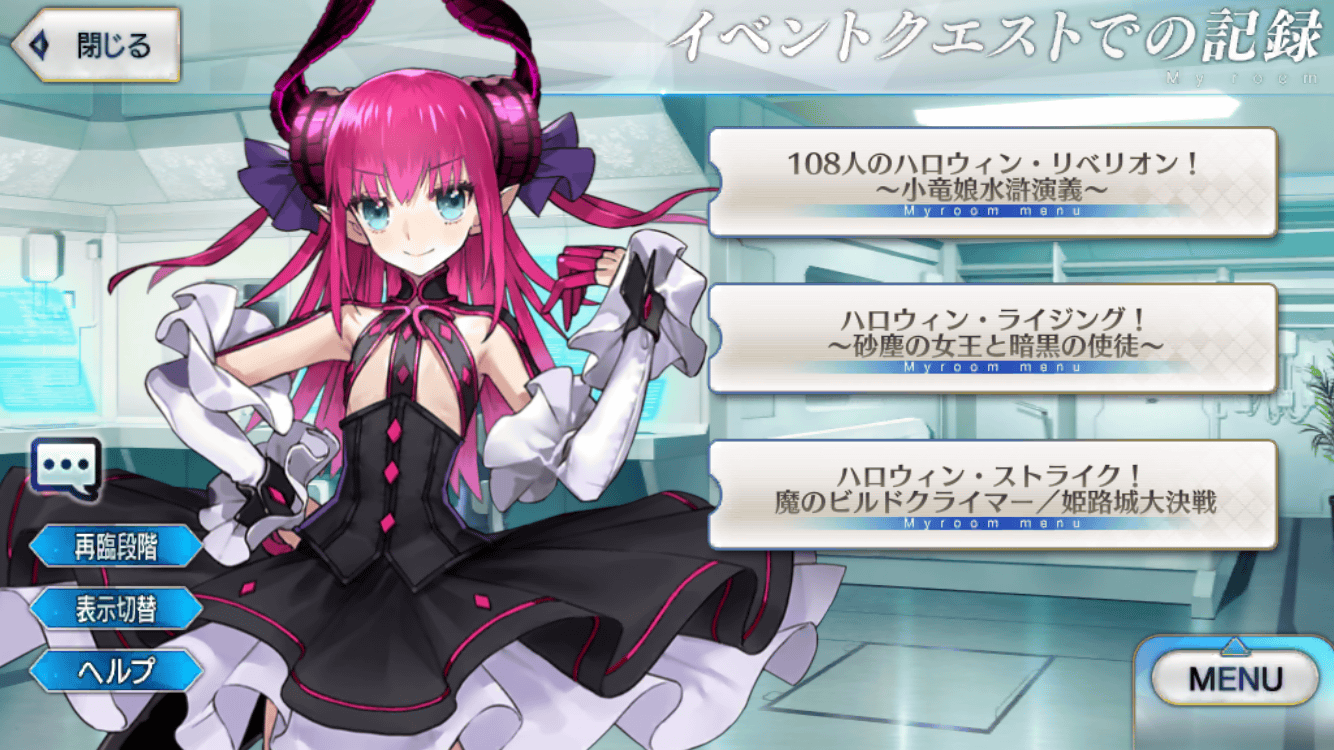 ※「マテリアル(ギャラリー)」にてイベントCGやムービーを閲覧するためには、過去のイベント開催時に体験している必要があります。 ※「ハロウィン・ストライク! 魔のビルドクライマー/姫路城大決戦」のイベントCGやムービーは、「チェイテ・ハロウィン・トリロジー ウルトラデラックス総集編!」で体験した場合でも「マテリアル(ギャラリー)」に追加されます。(10/26 18:00追記) ※過去のハロウィンイベントのなかで、イベントCGやムービーがないものは追加の対象外となります。