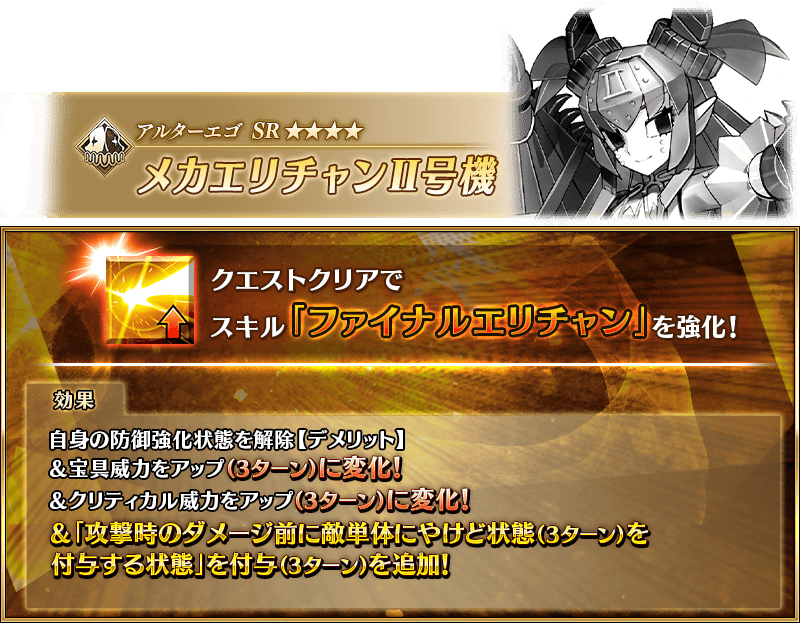 「★4(SR)エリザベート・バートリー」「★4(SR)エリザベート・バートリー〔ハロウィン〕」「★4(SR)メカエリチャン」「★4(SR)メカエリチャンⅡ号機」が強化される特別なクエスト「サーヴァント強化クエスト」が、カルデアゲートに恒常的に追加されます。