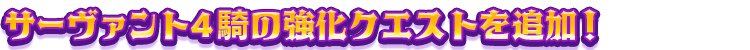 ※サーヴァント強化クエストにはアドベンチャーパートはありませんのでご注意ください。 ※対象サーヴァントを所持していない場合、クエストは出現しません。 ※クエストに開催期限はありません。