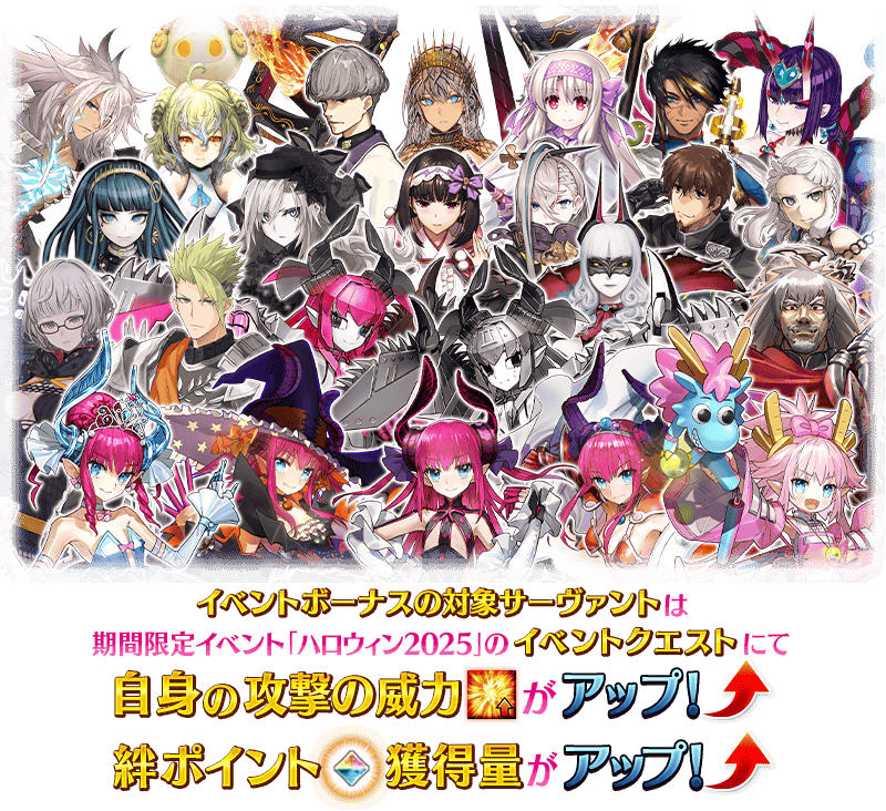 期間限定イベント「ハロウィン2025」の期間中、一部のサーヴァントはイベントクエストにおける「自身の攻撃の威力がアップ」と「絆ポイント獲得量がアップ」のボーナスを得られます!