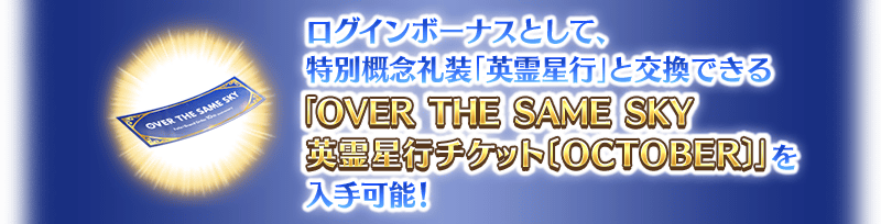 特別概念礼装「英霊星行」の「北海道・東北ブロック」全14種類の中からお好きな1枚と交換できる「OVER THE SAME SKY 英霊星行チケット〔OCTOBER〕」が手に入るログインボーナスを実施!