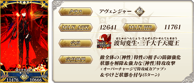 ※上記の「★5(SSR)魔王信長(織田信長)」のイラストとセイントグラフは霊基再臨第3段階のものです。 ※「★5(SSR)魔王信長(織田信長)」は「★5(SSR)織田信長」を霊基再臨第3段階にすることで名称が「★5(SSR)魔王信長」に変化します。