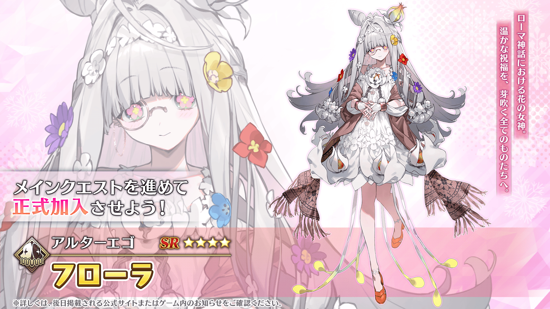 期間限定イベント「カルデアン・フロラリア あなたの花が咲く頃に」のメインクエストを進めることで、イベント限定の配布サーヴァント「★4(SR)フローラ」を正式加入させることができます。