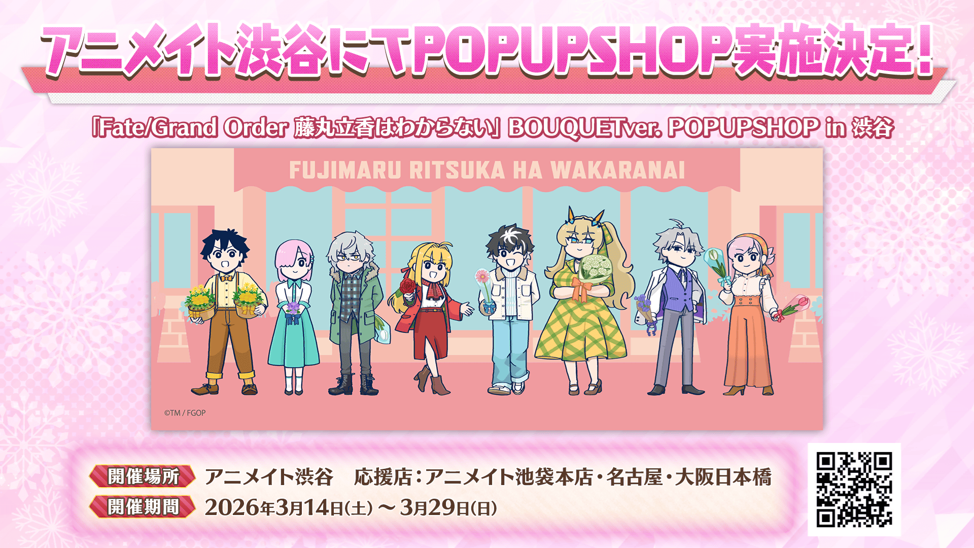 「Fate/Grand Order 藤丸立香はわからない」がアニメイト渋谷にてPOPUPSHOPの実施をすることが決定いたしました。