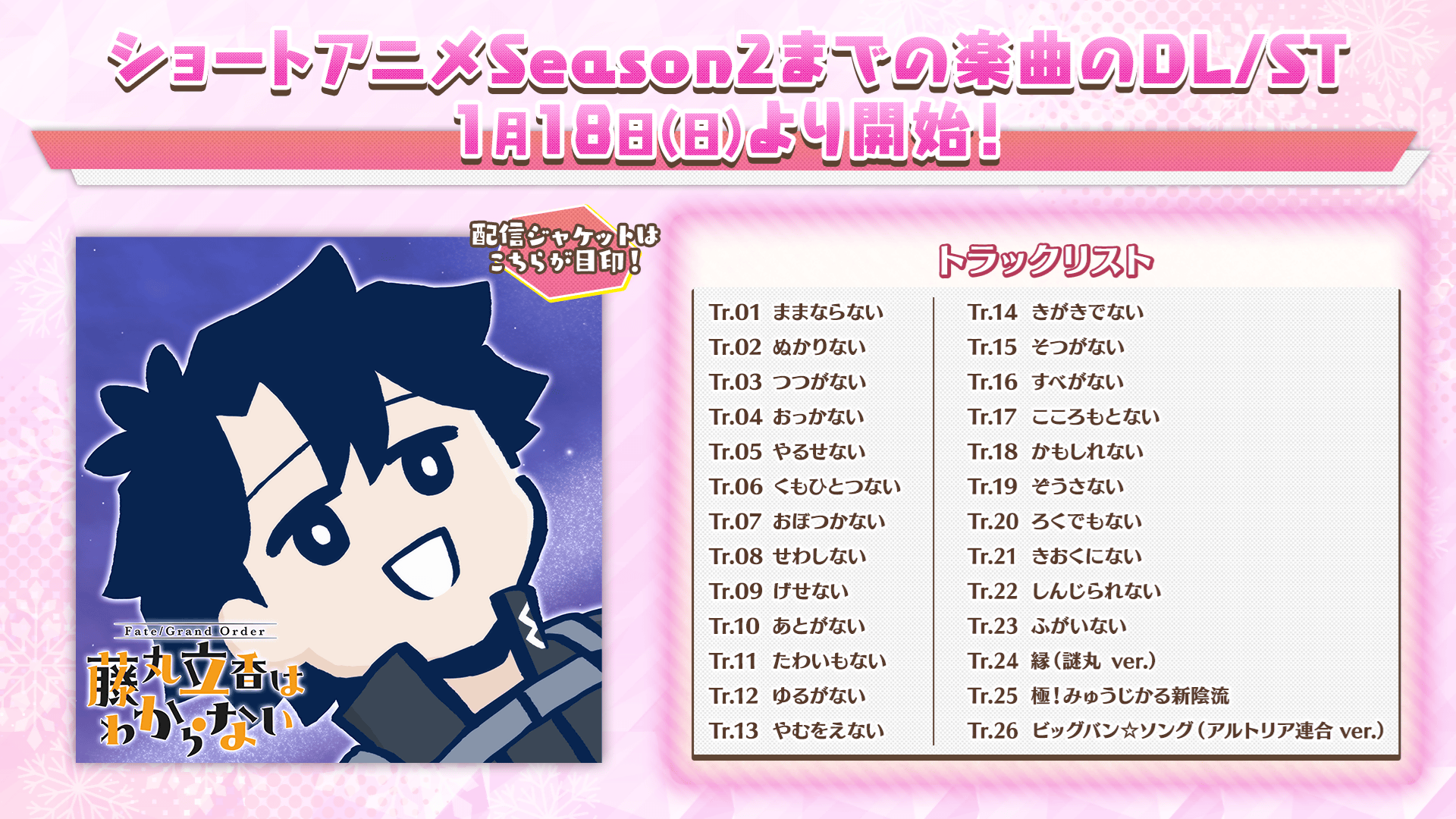 ショートアニメ「Fate/Grand Order 藤丸立香はわからない」のSeason2までの楽曲のダウンロード・ストリーミング配信が、2026年1月18日(日)より各種音楽配信サービスにて順次開始いたします。