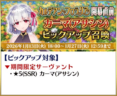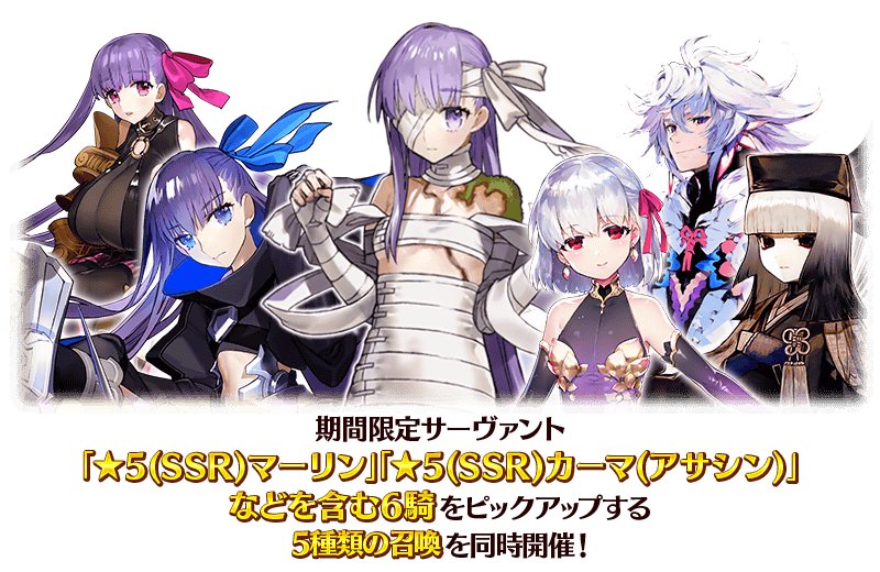 期間限定イベント「カルデアン・フロラリア あなたの花が咲く頃に」の開幕に向けて、期間限定サーヴァント「★5(SSR)マーリン」「★5(SSR)カーマ(アサシン)」などを含む6騎をピックアップする5種類の召喚を開催いたします!