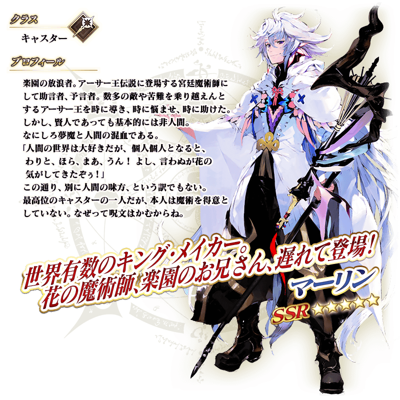 ※上記の「★5(SSR)マーリン」のイラストとセイントグラフは霊基再臨第2段階のものです。 ※第七特異点にてゲストサーヴァントとして登場した際とは、一部宝具効果が異なります。