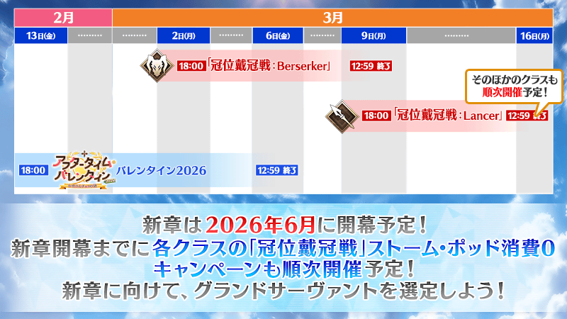 2026年3月2日(月) 18:00からは「冠位戴冠戦:Berserker」、3月9日(月) 18:00からは「冠位戴冠戦:Lancer」のストーム・ポッド消費0キャンペーンを開催いたします。